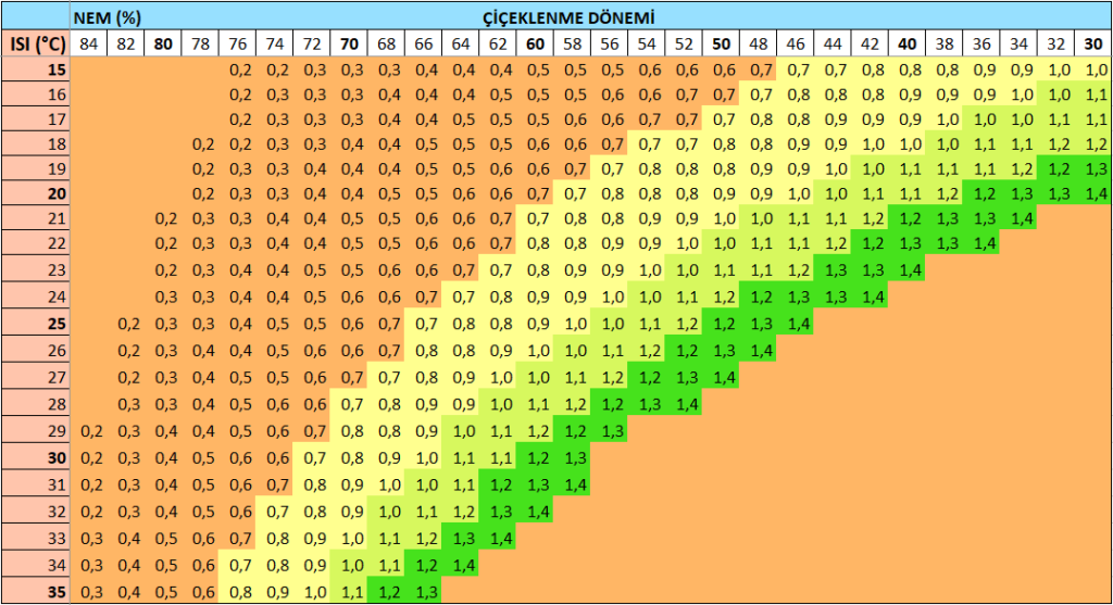 | Orta/Geç Çiçeklenme | 1.2 kPa | 1.6 Kpa | 24ºC | 40% |