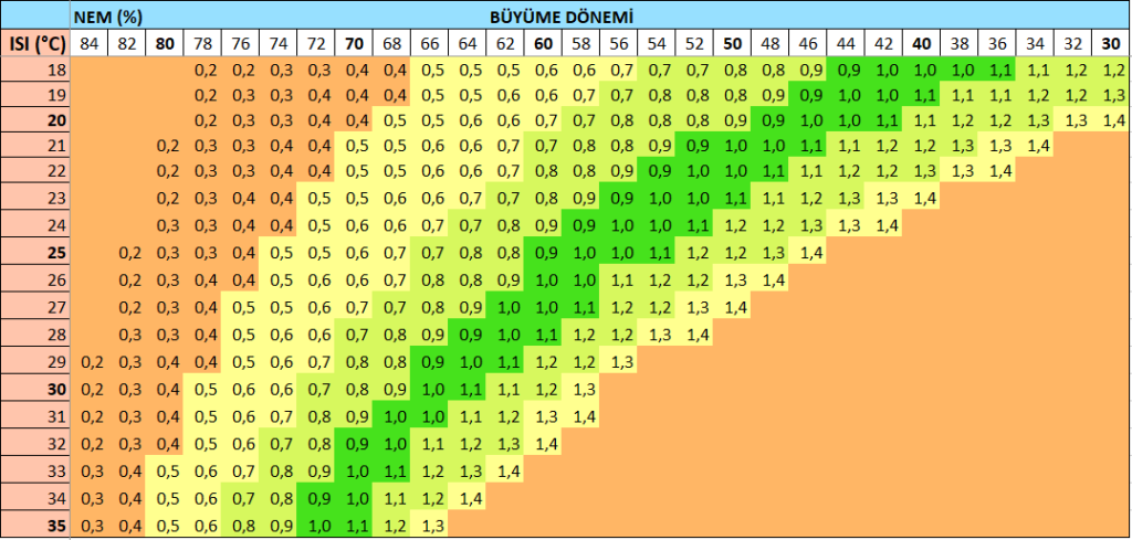 | Filiz/Erken Büyüme | 0.8 kPa | 1.0 kPa | 21ºC | 60% |
